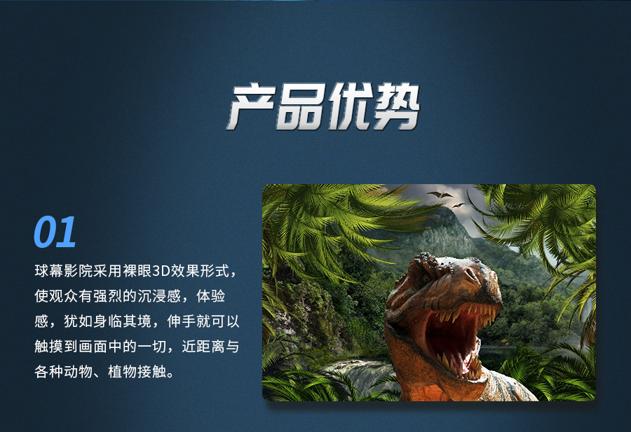 球幕影院以其獨(dú)特的視覺沖擊力,環(huán)繞立體聲效,讓觀眾有強(qiáng)烈的沉浸感,體驗(yàn)感,猶如身臨其境,伸手就可以觸摸到畫面中的一切,近距離與各種動(dòng)物、植物接觸。就像自己時(shí)而是宇航員,可以穿梭于浩瀚無(wú)際的宇宙中;時(shí)而猶如乘坐時(shí)間機(jī)器回到了恐龍時(shí)代,與龐大的恐龍同行。