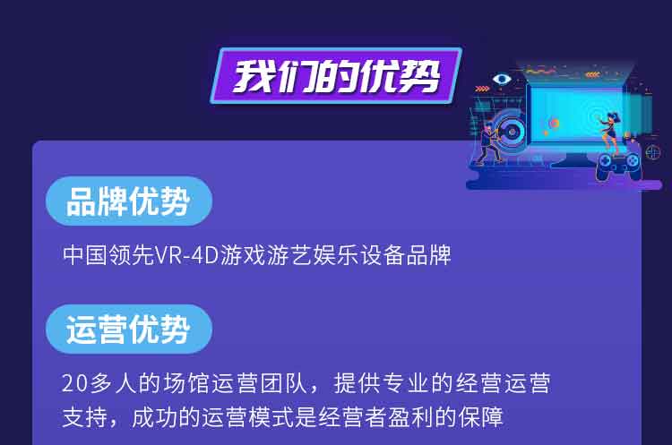 集先進(jìn)VR設(shè)備和創(chuàng)新游樂于一體的多元化科技娛樂場(chǎng)所。多重優(yōu)勢(shì),實(shí)現(xiàn)持續(xù)盈利,助您放心開店,從此輕松賺錢。