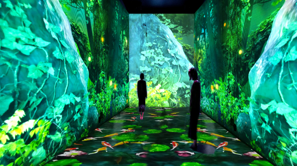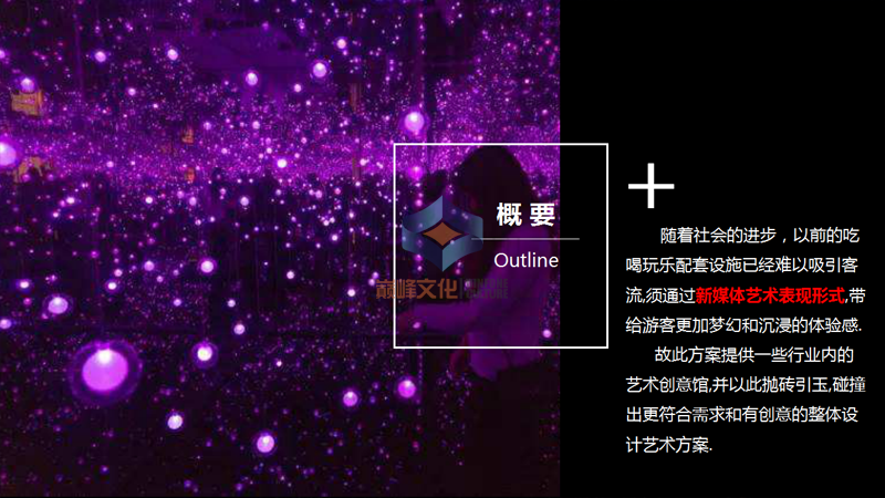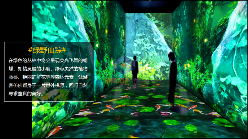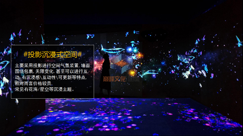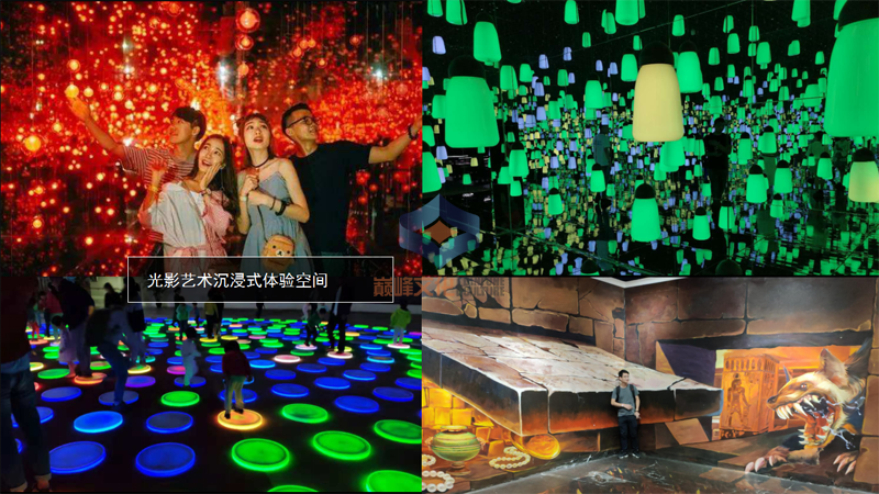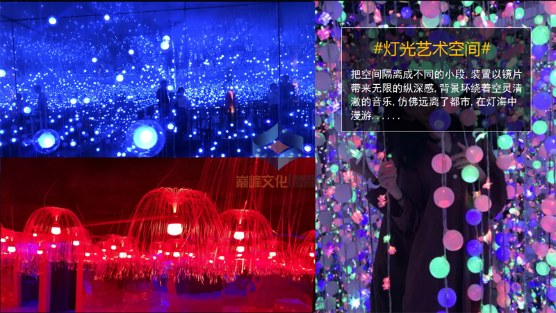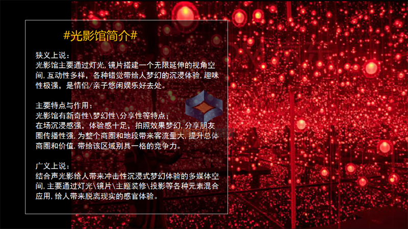 結(jié)合聲光影給人帶來沖擊性沉浸式夢(mèng)幻體驗(yàn)的多媒體空間,主要通過燈光\鏡片\主題裝修\投影等各種元素混合應(yīng)用,給人帶來脫離現(xiàn)實(shí)的感官體驗(yàn)。